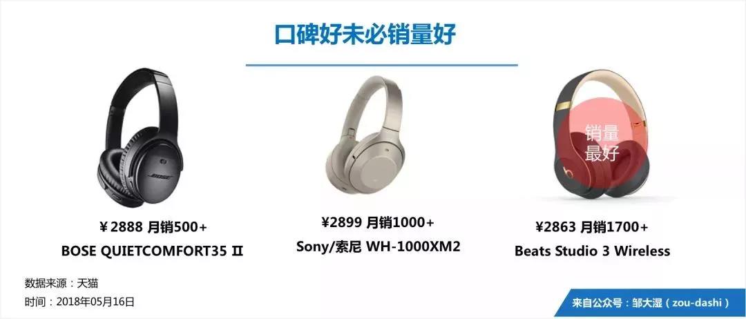 以2800價(jià)位的三款頭戴降噪耳機(jī)為例。無論是天貓購(gòu)買評(píng)分還是大眾口碑,Bose和Sony的產(chǎn)品,都要好過Beats。但Beats就是賣得最好。三款產(chǎn)品價(jià)位一致,論整體音質(zhì)和降噪效果,Beats都遜于Bose和Sony,憑什么賣得最好?因?yàn)锽eats,有讓人購(gòu)買的理由。