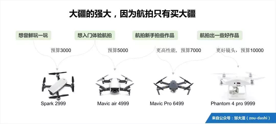 只要你想要買航拍無人機(jī),你的購(gòu)買決策,就會(huì)掉進(jìn)Spark-Mavic-Phantom三元產(chǎn)品陣營(yíng)中。從3000價(jià)位到萬元價(jià)位。任何一個(gè)區(qū)段的需求,你除了大疆,都沒有可選。
