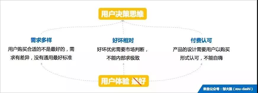 總結(jié)來說,用戶決策思維依然是以用戶為中心。不求單向體驗(yàn)最好,而是綜合需求多樣、好壞相對(duì)和付費(fèi)認(rèn)可三個(gè)維度。
