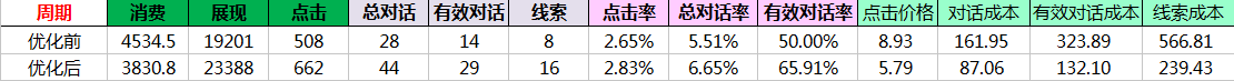 優(yōu)化分析總結(jié):根據(jù)數(shù)據(jù)可以看出,該賬戶在優(yōu)化前的線索成本比較高,平均一個(gè)線索就在500元左右,賬戶一天的預(yù)算在1500,共推了6種類型病種,屬于多產(chǎn)品賬戶,但是賬戶的搭建比較亂,不能夠很好的控制住每個(gè)病種的流量,導(dǎo)致線索率一直很低。而厚昌網(wǎng)絡(luò)接手該賬戶后首先對(duì)賬戶的結(jié)構(gòu)進(jìn)行了重新的梳理搭建,并按照產(chǎn)品+平臺(tái)的方式進(jìn)行賬戶的維度搭建,針對(duì)性關(guān)鍵詞意向的強(qiáng)弱進(jìn)行出價(jià),再結(jié)合每個(gè)單元的不同需求來(lái)撰寫不同的創(chuàng)意,以此增加相關(guān)訪客的點(diǎn)擊率。根據(jù)數(shù)據(jù)可以明顯的看出,通過(guò)一周左右的優(yōu)化,賬戶的消費(fèi)由原來(lái)的4534.5下降到3830.8,線索成本由566.81下降到239.43,有效對(duì)話率從50%上升到65.91%,線索也從原來(lái)的8個(gè)增加到16個(gè),整整增加了一半的量,效果顯而易見的上升。