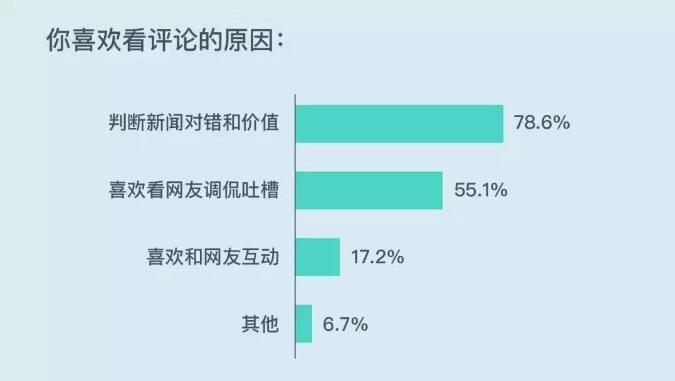 帶有互動性的評論成為新的流量增長地。在用戶閱讀新聞和資訊的過程中超過70%的人經(jīng)常會有意識地瀏覽頁面評論。報告顯示,除了幫助判斷新聞本身的對錯和價值,單純只是喜歡看其他人的調(diào)侃和吐槽是55.1%的人的訴求。