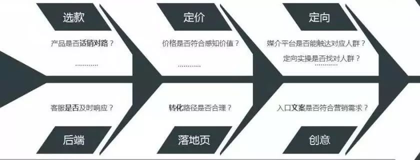 根據圖示,我們可以了解到整個投放環(huán)節(jié)涉及到了6塊內容,分別是一開始的選款,然后是針對性的定價,接著是投放相關的定向、創(chuàng)意、落地頁,然后還涉及到客服等后端,這里面每一步都可以再拆分成很多小步驟。