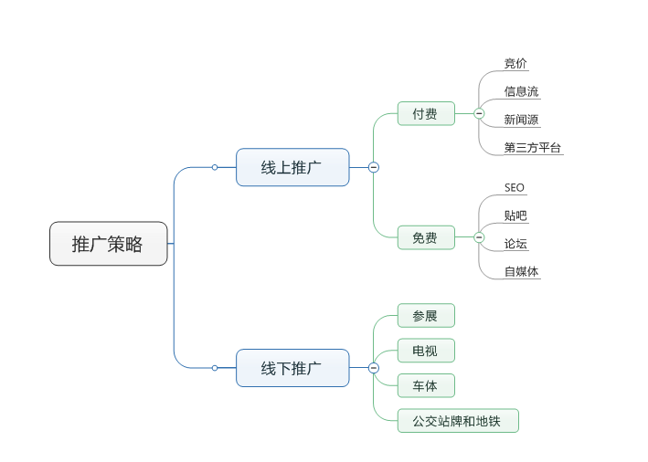 做好市場分析,我們就可以著手開始制定推廣策略。有了以上的準(zhǔn)備工作,你在渠道選擇上會更有針對性,如以下思維導(dǎo)圖,我們會將推廣策略分為線上和線下兩個部分,我們今天著重介紹一下線上推廣的部分。